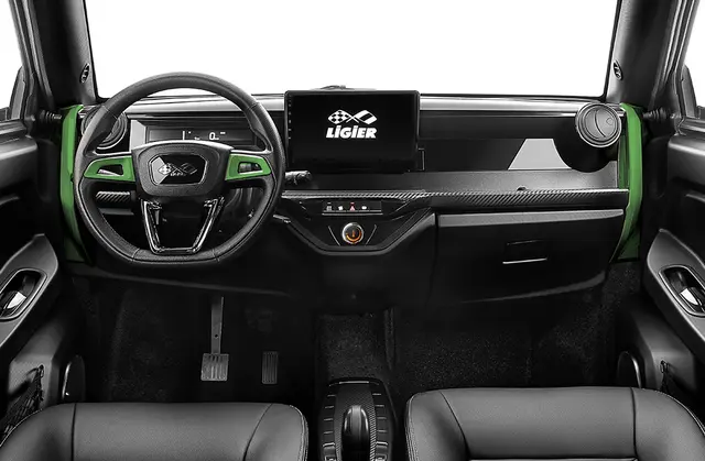 - Sièges Premium similicuir, surpiqûres ivoires, appui-tête grain carbone et logo Ligier